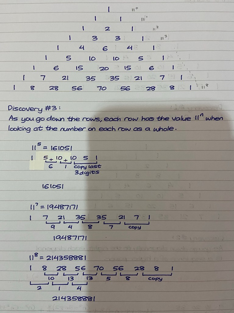 Through our year in MAAHL, we have done countless of assignments and discovered a lot of things during class discussions. One discovery that stands out the most to me is when I found that you can actually find the powers of 11 from the Pascal triangle.